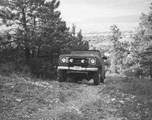 So, Julie got out and walked up the hill a little bit with the camera, while I fired up the '77 again. Slip it into 1st gear, 4-lo (6:1, x 4.11s) and started creeping forward, giving 'er some power.