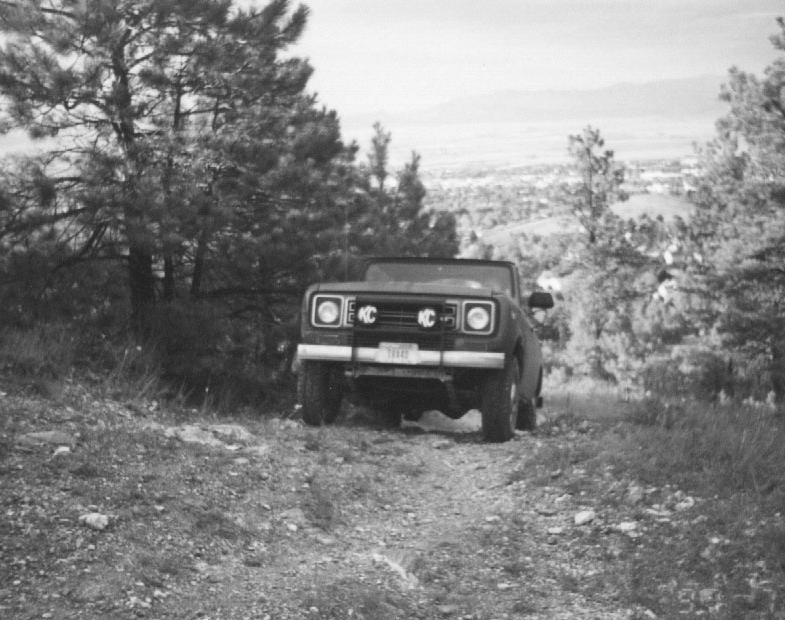 Julie got the camera ready (she was supposed to take pictures on the way up, along with flagging me if I was about to smack something important on the rocks.. she warned me, but forgot to snap a shot). So I climbed back into the Scout, throttled up, and scratched, clawed, and banged my way over the rocks, Julie taking about three pictures on my way over.